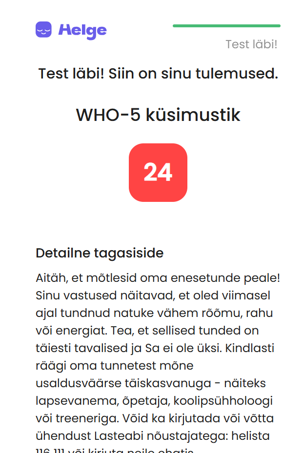- Õpilase tulemuste vaade. Õpilane saab saadud tulemused kas endale privaatselt salvestada, edastada endale e-posti teel või teha tulemusest lihtsalt ekraanitõmmise. Kui noor näeb oma tulemust skaalal 1-100, siis alla 50 punkti tulemus võib viidata madalale heaolule. Tulemus annab noortele võimaluse oma heaoluga teadlikumalt tegelda ning soovituse, et kui tulemus on madal, võiks ta soovi korral pöörduda abi saamiseks tugispetsialisti, lapsevanema või usaldusväärse täiskasvanu poole.