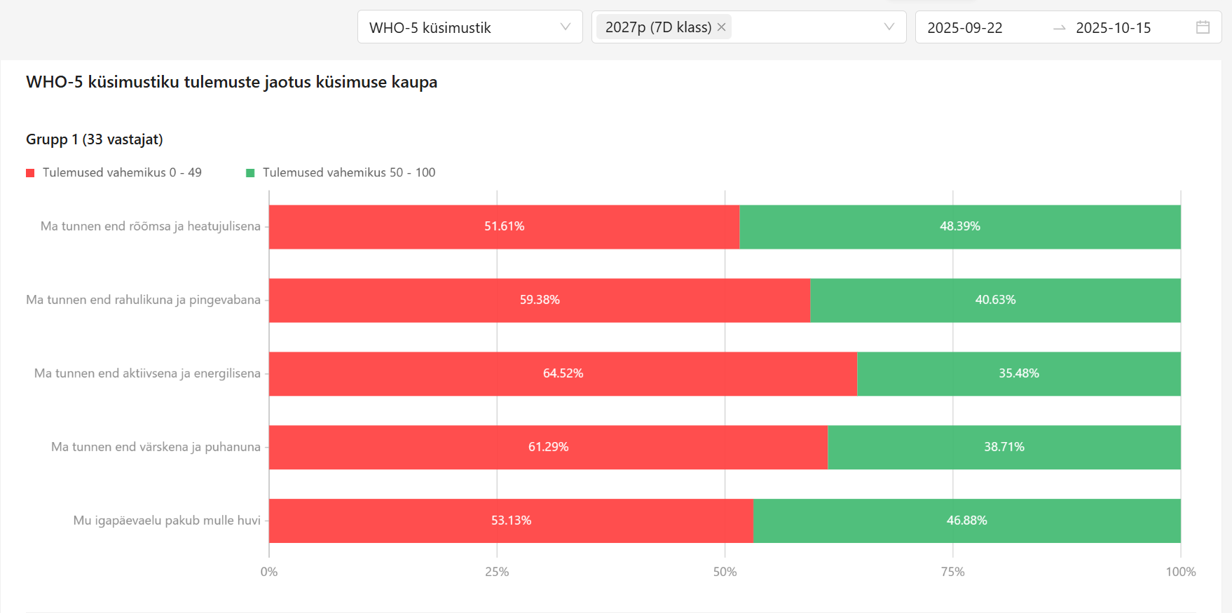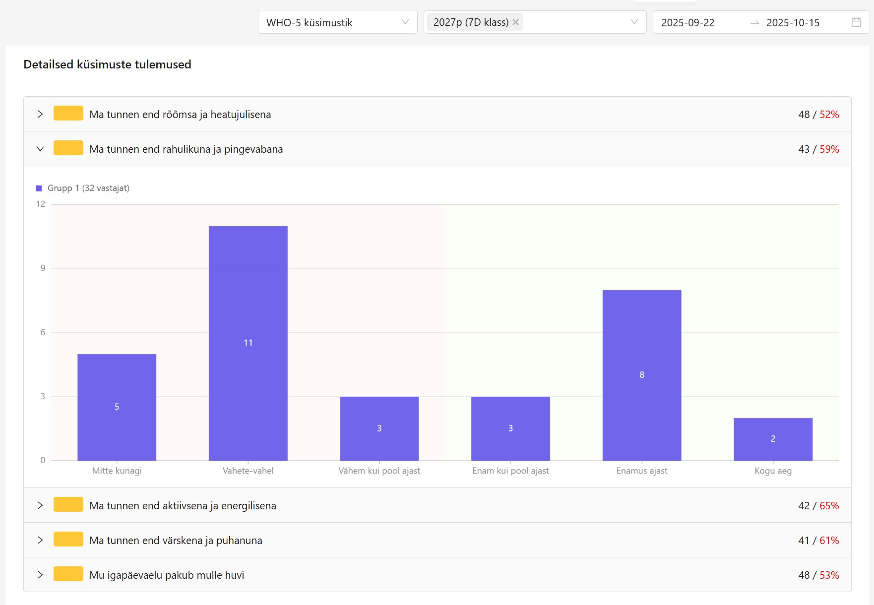 - Täiskasvanute hindamine: Saame nüüd süsteemselt jälgida ka õpetajate heaolu, mis on kogu koolikeskkonna toimimise oluline alus.